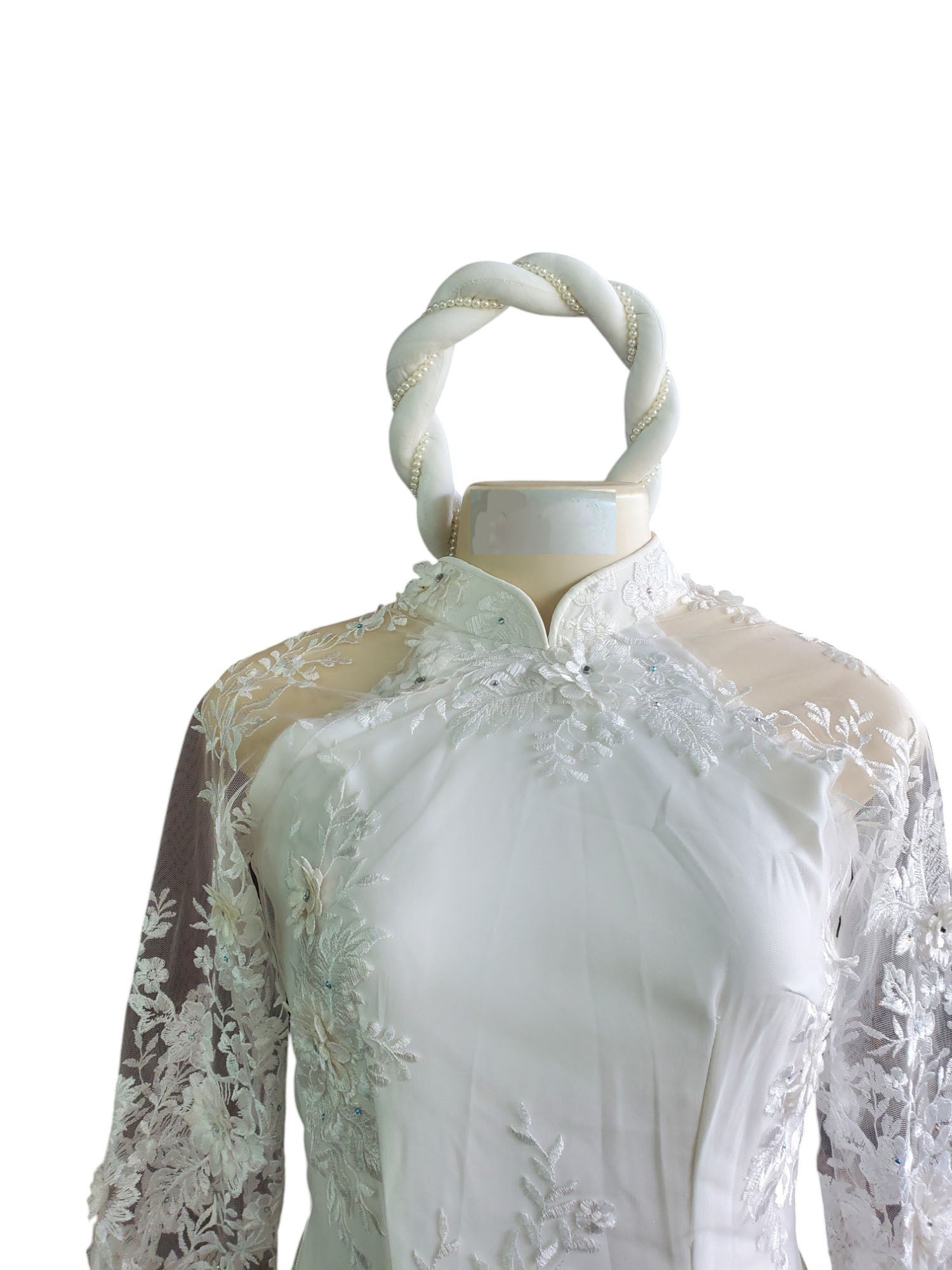 A casual and easy-to-wear Vietnamese accessory, this item comes in multiple colors, typically with small white pearls decorating the headband. We can also custom order unique designs if you would like something more extravagant, such as for a wedding or tea ceremony; simply send us a message.